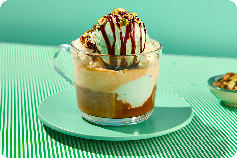 Affogato er en stor trend, og en variant som står seg like godt alene som en dessert. Med varm espresso, en deilig kule med pistasj og et dryss av pistasjnøtter på toppen sitter du igjen med smilende kunder. Med sjokoladesaus og krem på toppen kan man gjøre noe ekstra ut av retten, eller tilpasse den til en barnemeny med kakao og iskrem.