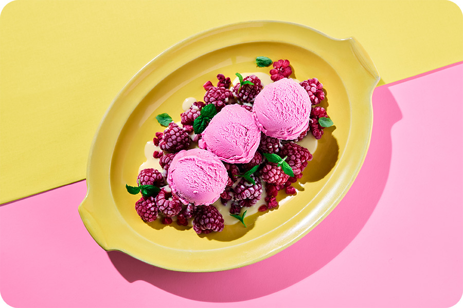 En fargerik kombinasjon av Bringebærsorbet, bær og hvit sjokoladesaus. Denne desserten setter farge på menyen og er en frisk og lett dessert med bred appell.